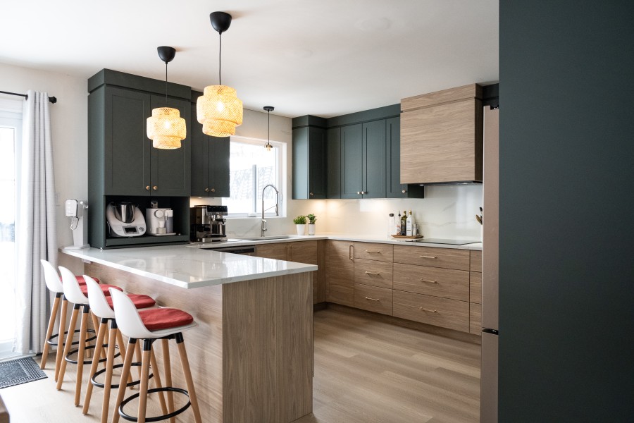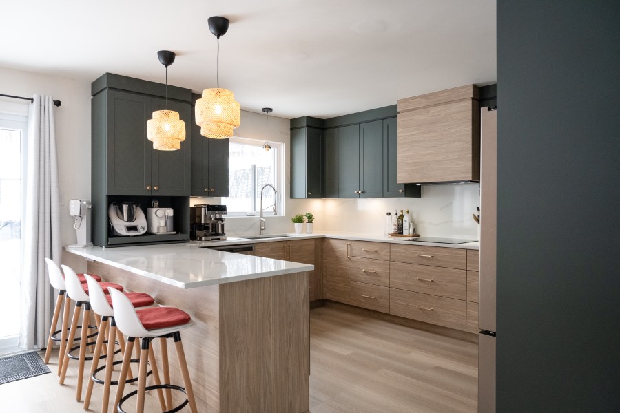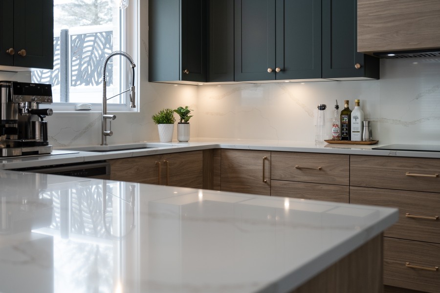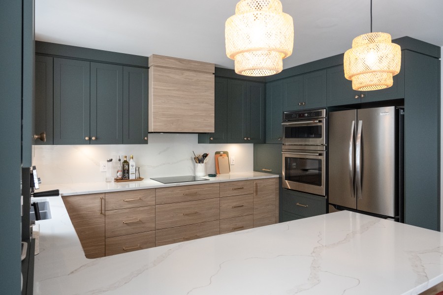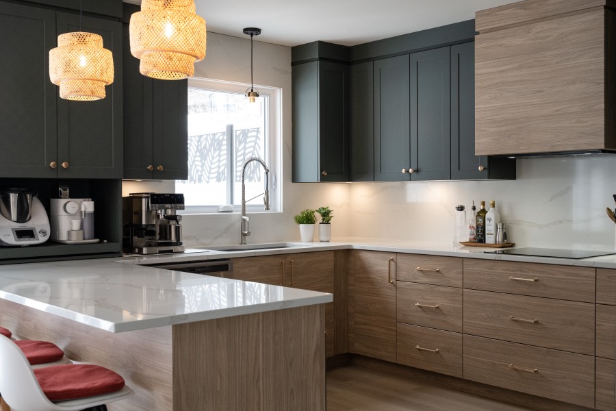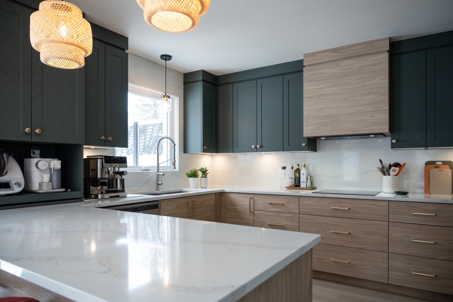 Le contraste entre les deux tons d’armoires apporte du caractère à la pièce, tandis que les lignes épurées du style shaker et slab créent un équilibre parfait entre modernité et intemporalité. Le quartz Calacatta Gold illumine l’ensemble avec ses veines délicates, alors que la quincaillerie or brossé ajoute une touche raffinée qui capte subtilement la lumière.