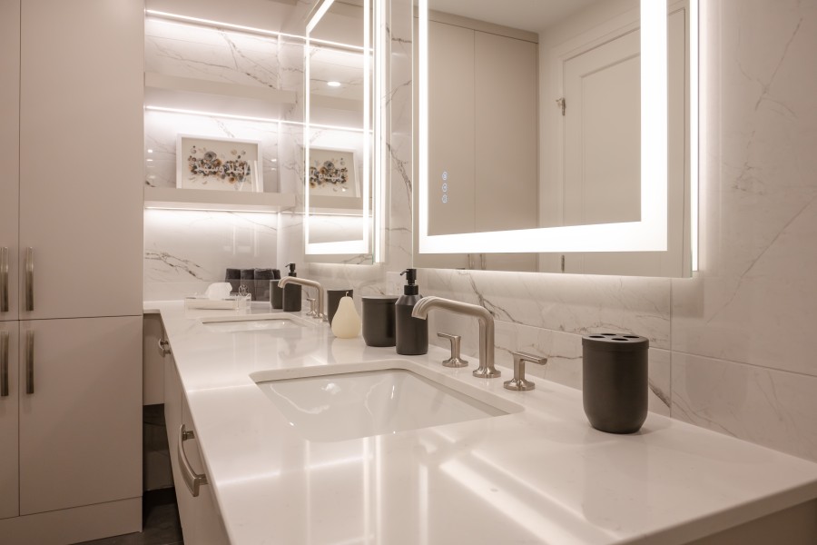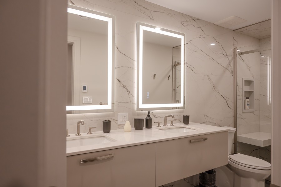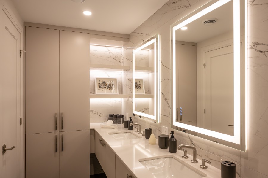 Les miroirs illuminés ajoutent un effet haut de gamme tout en optimisant la luminosité de l’espace.